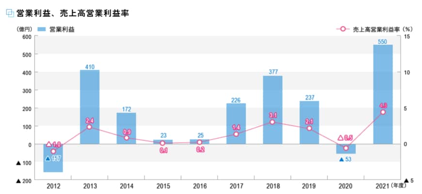 2021年度の営業利益は550億円となっていますが、2020年度は▲53億円の赤字になっており、先行きの読みづらさや変動の大きさがわかります。