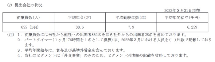 ゼンショーホールディングス(提出会社)の2022年3月末時点での従業員数、平均年齢、平均勤続年数および平均年間給与は以下の通りです。