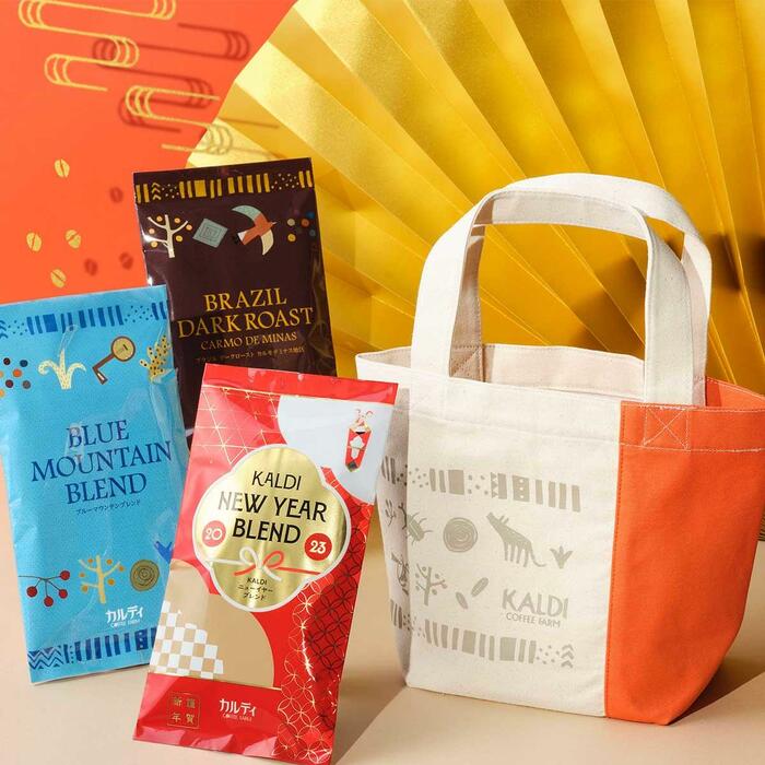コーヒー福袋3種は、2023年の初売りからの販売となります。新年を彩る華やかな香りの「KALDI ニューイヤーブレンド」と、香りと甘み、苦みと酸味が織りなすバランスが秀逸な「ブルーマウンテンブレンド」、しっかりとした苦みとダークチョコレートの甘い余韻を引き出した「ブラジル ダークロースト カルモデミナス地区」の3種のコーヒーが入った福袋です。
