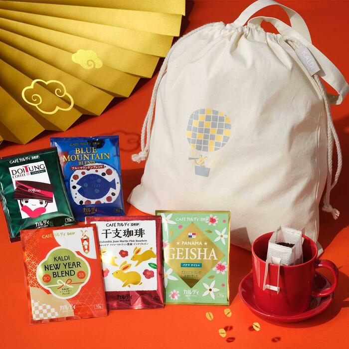 この時期限定の「KALDI ニューイヤーブレンド」や「干支珈琲 コロンビア ファン・マルティン農園 ピンクブルボン」、「ブルーマウンテンブレンド」などの人気のドリップコーヒー4種に、希少な「パナマ ゲイシャ」がセットになった、たっぷり28杯分が楽しめるバラエティ豊かなドリップコーヒーのアソートです。持ち手がついたバッグは、きゅっと絞れる巾着タイプで、旅行の小物入れにもおすすめです。