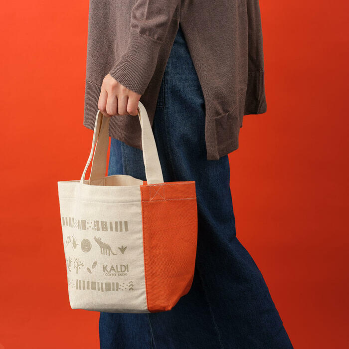 バッグは、新年らしい朱色と白の2トーンカラーの舟形トートで、財布やスマートフォンなどを入れて持ち運ぶのに便利なサイズ感です。