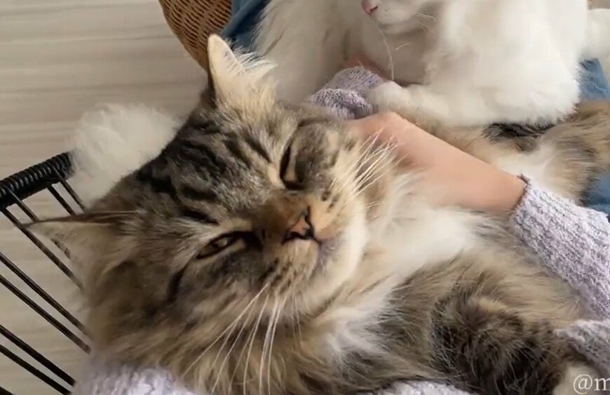 そこに写っているのは、飼い主さんの脚の上でくつろぐ2匹の猫ちゃんたち。