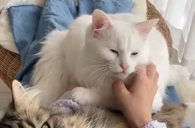 白猫の「マオ」くんは、現在1歳の男の子。生後2週間頃、雨の降る日に捨てられていたといいます。