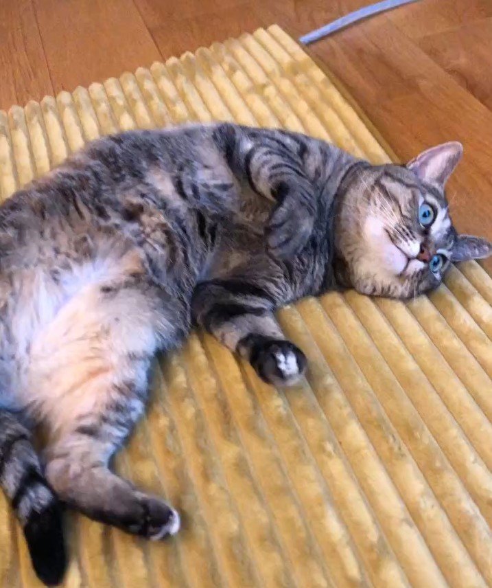 ホットカーペットらしき場所で快適そうにくつろいでいるのは、キジトラ猫の「コウ」ちゃん。まん丸の瞳とモフモフのお腹がとっても印象的な、4歳の女の子です。