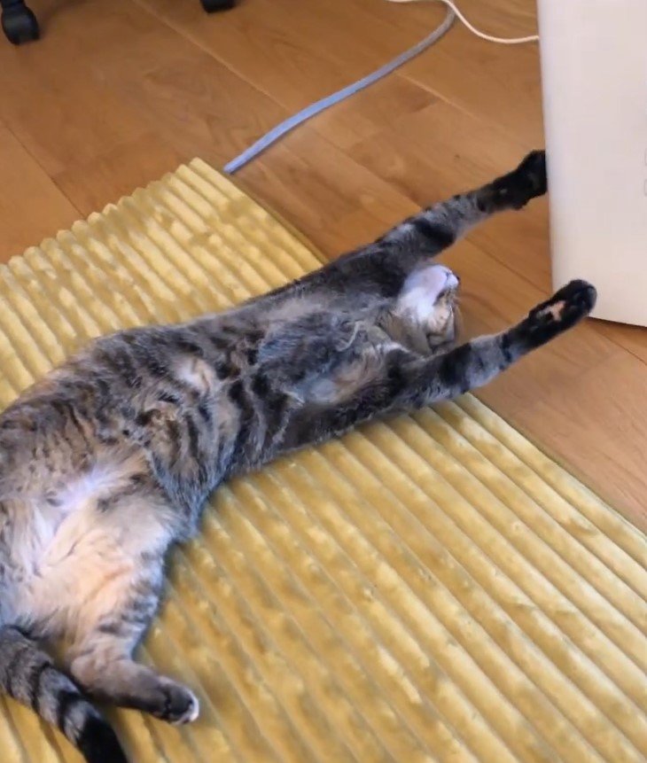 へそ天の状態でグーッと手を伸ばしたり片足を上げたりと、警戒心の感じられないくつろぎ姿に心をくすぐられてしまいます。