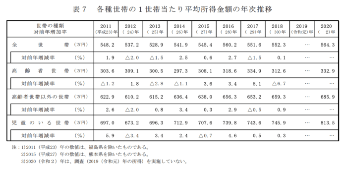 厚生労働省「2021年 国民生活基礎調査の概況」によると、「児童(18歳未満の未婚の者)のいる世帯」の平均所得金額は2020年で813万5000円です。