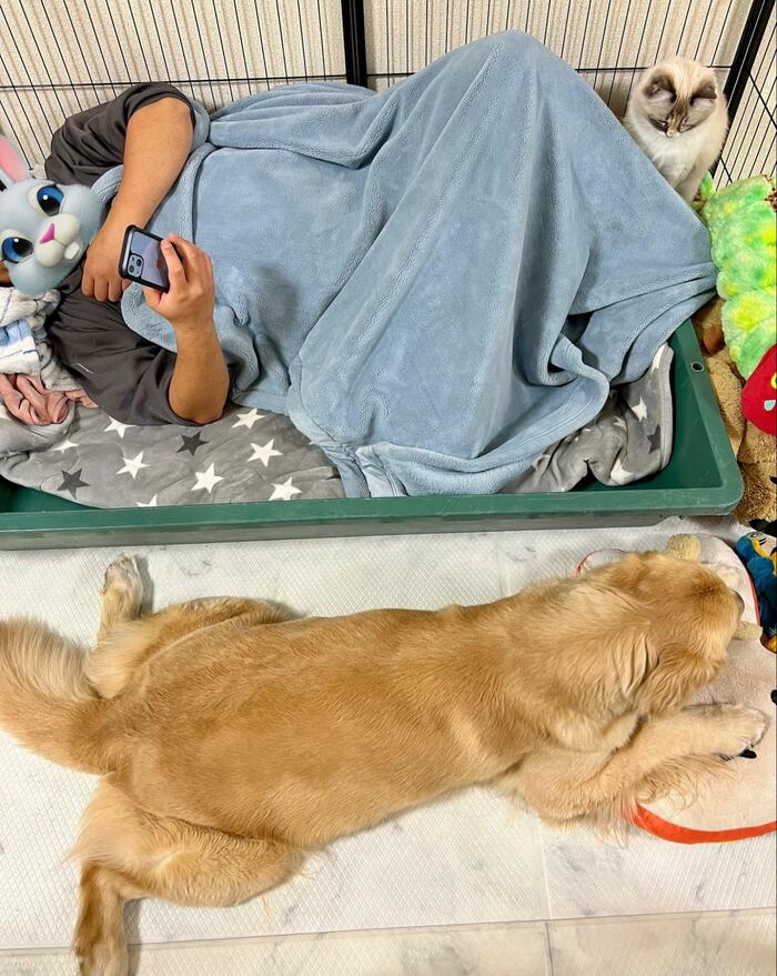 「妊婦犬が産箱の外にいて…パパが産箱の中にいて…猫が産箱のふちにいる。妊婦犬を安心させるための作戦かな」