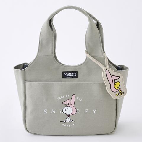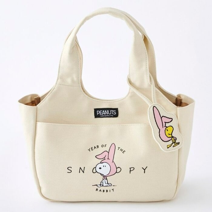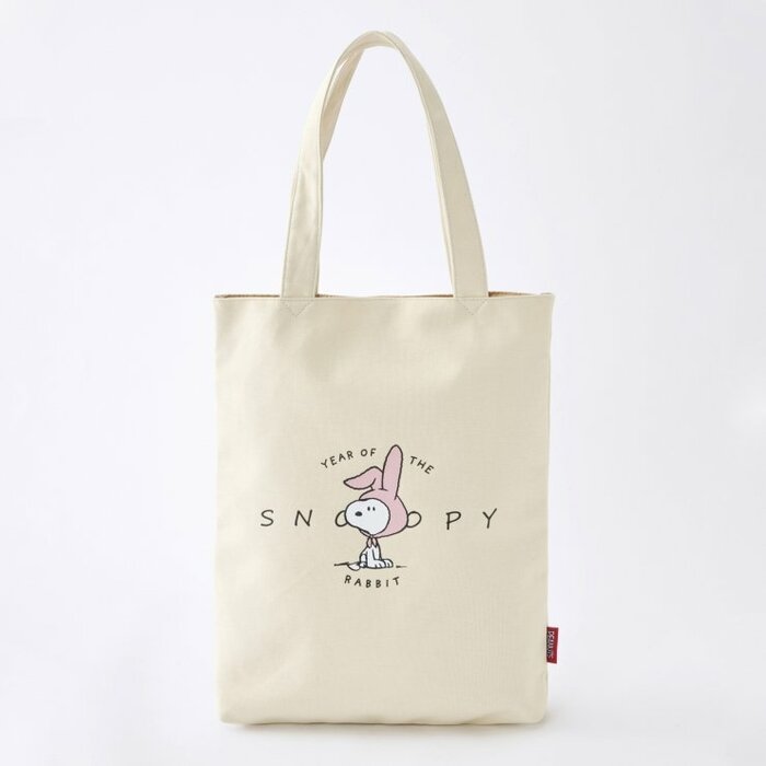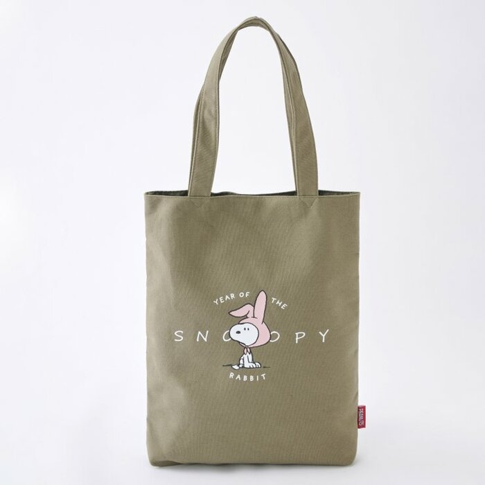 A4サイズが入る便利なトートバッグです。スヌーピーがウサギに変身。2023年にピッタリなデザインですね。ホワイトとイエローグリーンの2色を展開しています。