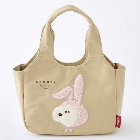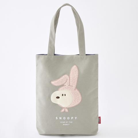 A4サイズが入る便利なトートバッグです。スヌーピーがウサギに変身。もこもこ部分がキュートなデザインです。ホワイトとグレーの2色を展開しています。