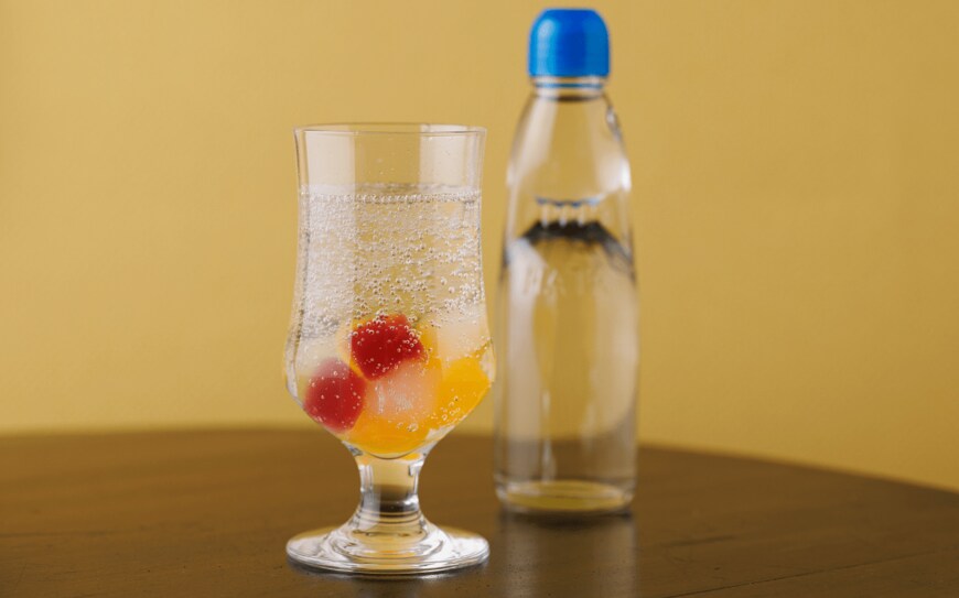 乾杯のドリンクは、浅草の風物詩的な存在の「ビー玉入り瓶ラムネ」。カラフルなゼリーが入ったグラスに注ぐと、万華鏡のような美しさを楽しめます。