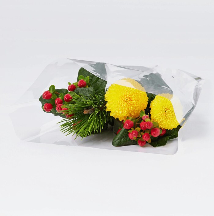 新春を気持ちよく迎えられる素敵なブーケをユニクロが提案。期間限定の迎春ブーケで、松1本、ピンポンマム2本、ヒペリカム2本を合わせたブーケとなっています。サイズは、高さ約46cm×幅約14cm×奥行約11cmとなっています。