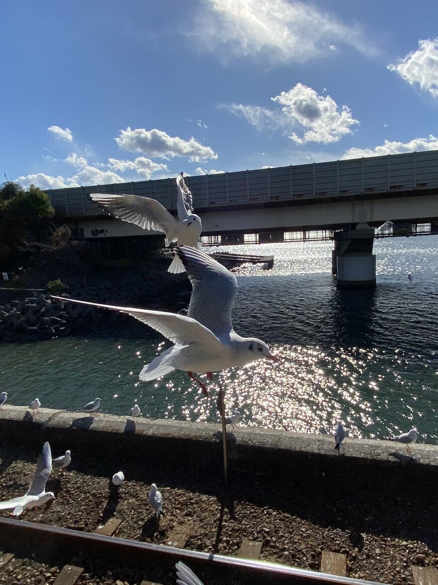 太陽に照らされて、神々しい雰囲気になっていますね。飛んでいるユリカモメを撮影しているため、この瞬間しかない構図で狙って撮るのは難しいと言えるではないでしょうか。