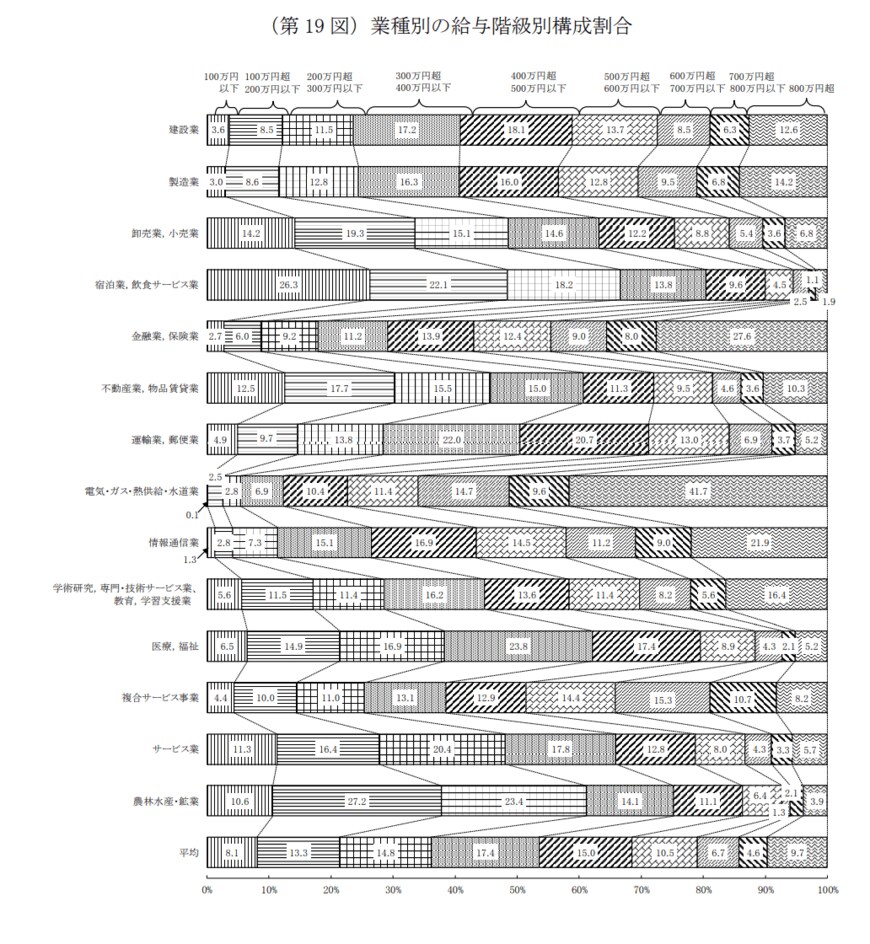 年収600万円以上の割合が多い業種は「電気・ガス・熱供給・水道業」です。その後に、「金融業・保険業」、「情報通信業」と続いています。