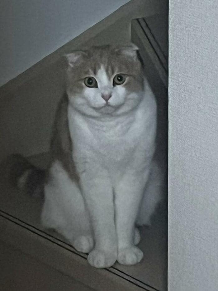 とろくんは両手をきれいに揃えて、階段の上にお行儀よく座っています。チャーミングなまん丸の瞳を大きく開けて、飼い主さんに視線を送っていますね。