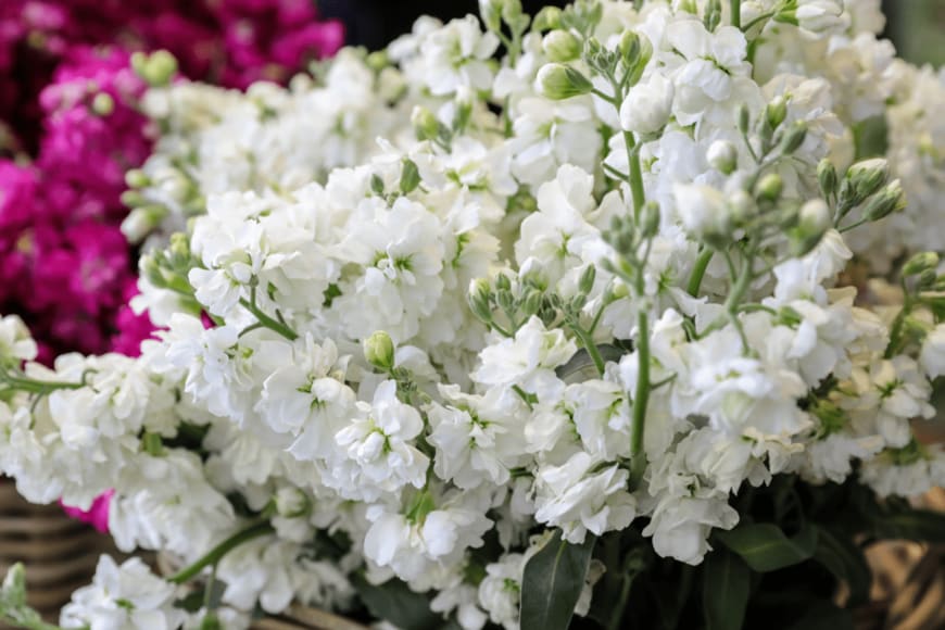 草丈の高いストックは茎の上の方に花がつく華やかな植物。ピンクやイエロー、パープルの花色もオシャレでステキなのですが、今の時期はホワイトカラーもオススメです。