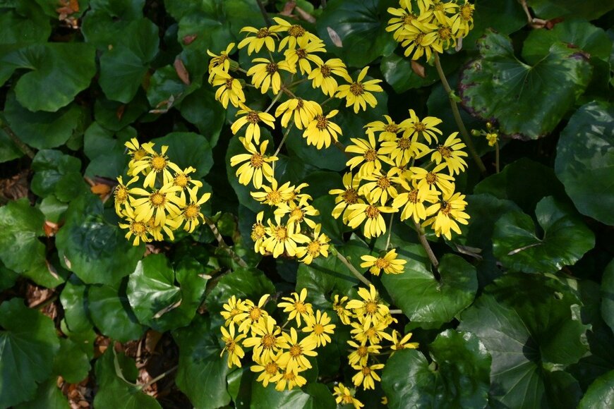 山野草として知られるツワブキはイエローやホワイトの花を咲かせる野趣あふれる花。明るめの日陰が生育場所にオススメです。