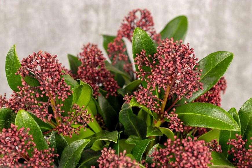 スキミアはレッドやホワイトのツブツブのツボミが可愛い常緑低木。クリスマスローズなど、他の冬の植物とも相性がよいので一緒に植えてみるのもオススメです。