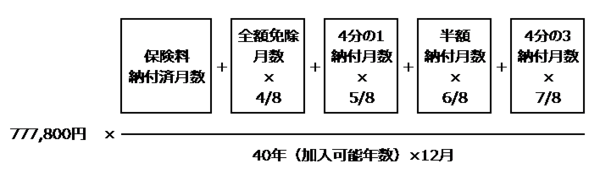 免除や未納などで40年に満たない場合には減額となり、以下のような計算式で求めます。