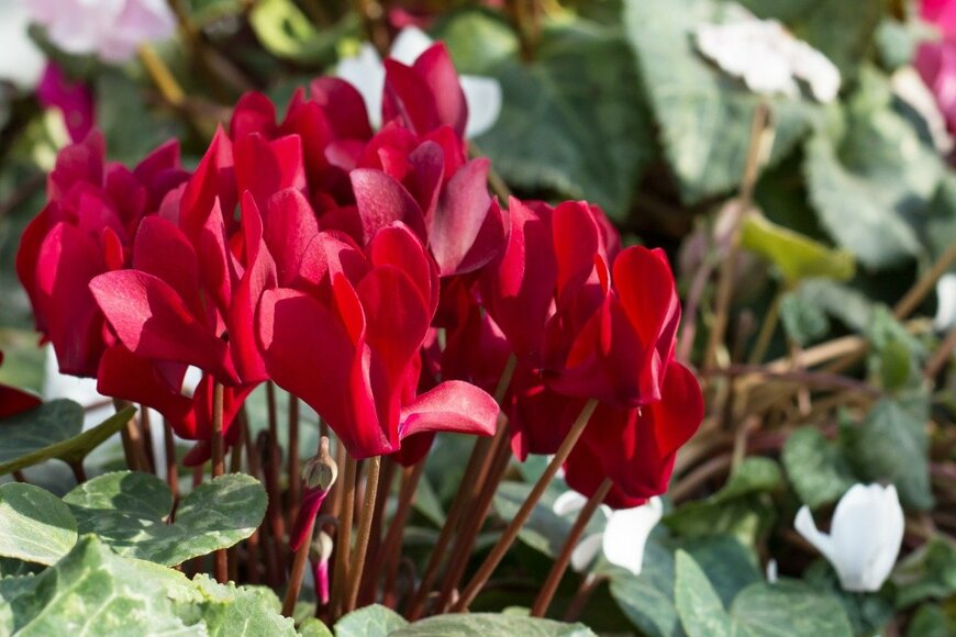 深紅のガーデンシクラメンはベルベットのような質感でゴージャスな雰囲気を、ホワイトのシクラメンは透き通るような美しさを堪能できます。この他にもバイカラーの可愛い品種が出回っています。