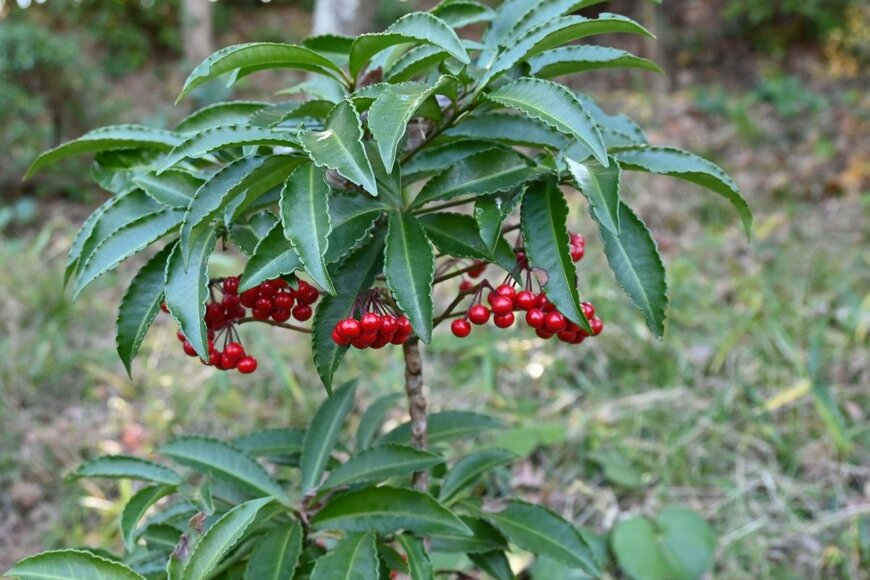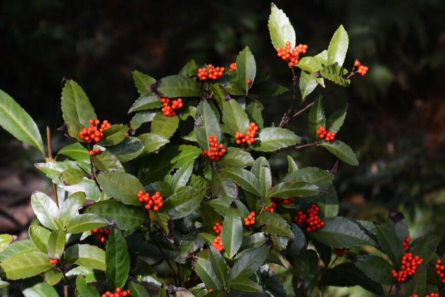 お正月を象徴する植物、また縁起モノ植物としても知られる千両と万両。どちらも樹高約1メートルで、秋から冬にかけて赤い実が鑑賞できる常緑低木です。
