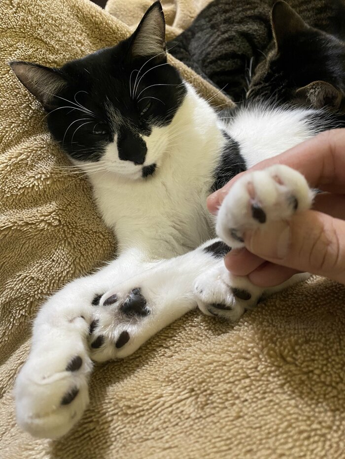 そして投稿には、「手相をチェック。この指にチョンチョンとある黒い点は『幸せ』と『健康』を表しています。これから50年は元気良く最高の猫生を送れるでしょう」という、占い風のコメントが添えられていました。