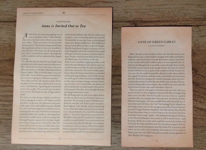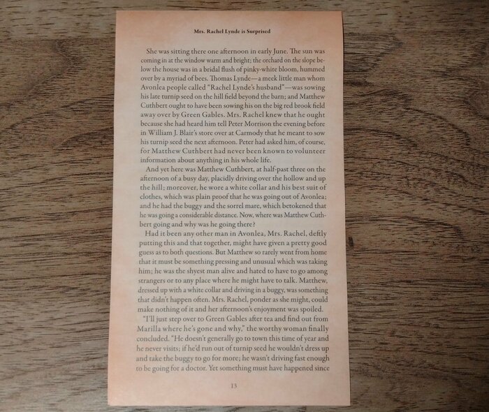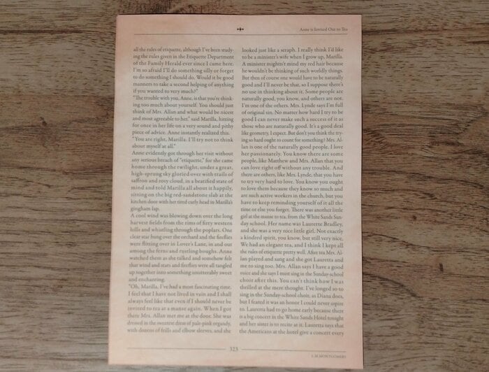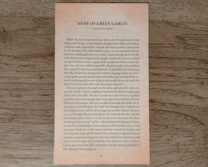 こちらは小さいほうのデザインペーパーです。『赤毛のアン』の第一章の冒頭部分のページがデザインされています。