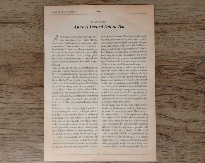 こちらは大きいほうのペーパーです。第22章「アン、お茶に招かれる」の冒頭がデザインされています。