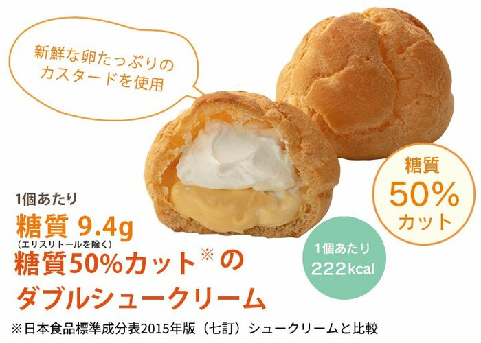 こちらのシュークリームは、日本食品標準成分表2015年版(七訂)のシュークリームと比べて50%も糖質をカットしています。9.4g(エリストールを除く)に糖質を抑えながらも、中には濃厚なホイップ入りカスタードクリームと、なめらかなホイップクリームが入っていて満足感たっぷり。カスタードには新鮮な卵がふんだんに使われており、素材のおいしさも光っています。