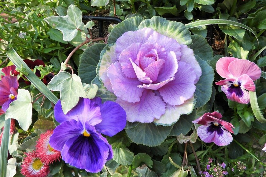 寄せ植えや生け花で正月に活躍するハボタンは、冬から春の花壇でもまだまだ楽しめます(※編集部注)。
