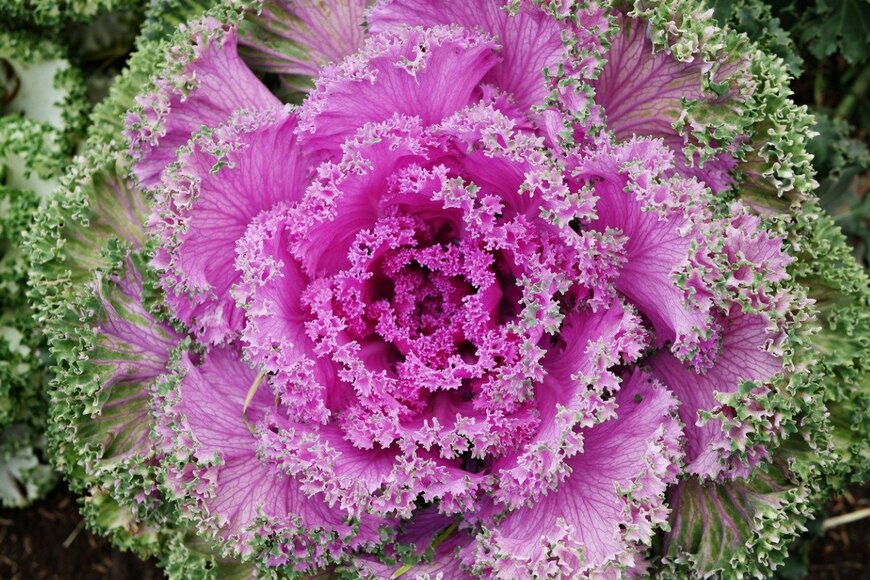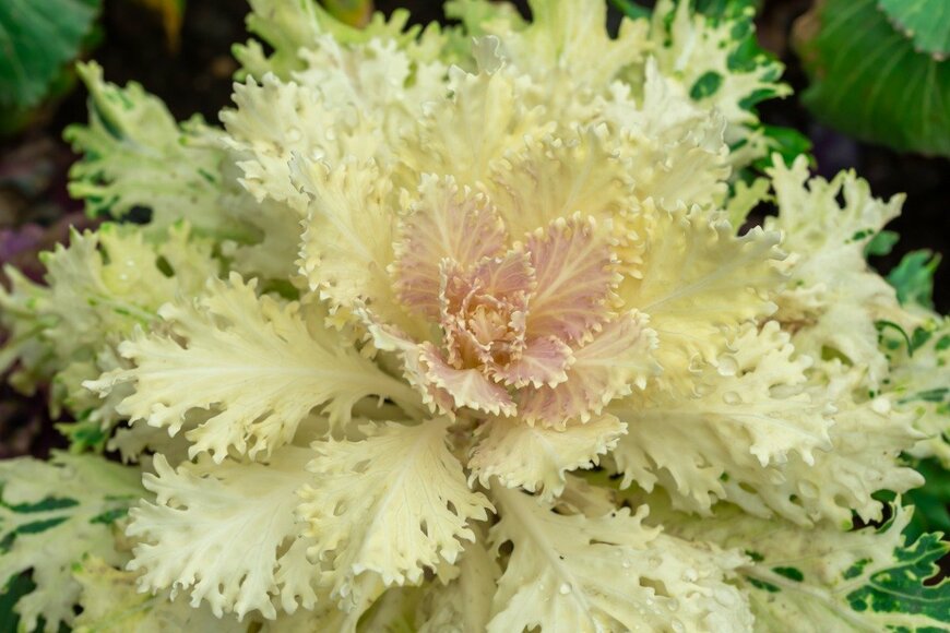 切れ葉系はたくさんの切れ込みが入った葉が特徴的なハボタンです。雪の結晶のような葉が美しく、さんご系、くじゃく系とも呼ばれます。