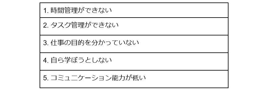 まずは、仕事ができない人の特徴を5つ見ていきます。
