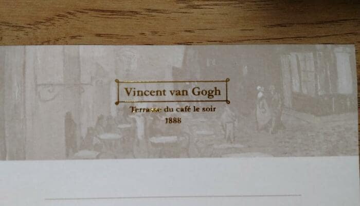 表面にも《夜のカフェテラス》がデザインされています。その上に、「Vincent van Gogh」と「Terrasse du café le soir」と箔押しされています。