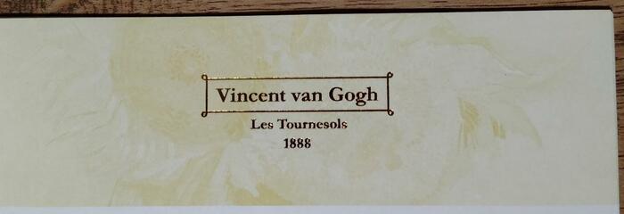 裏面上部には、「Vincent van Gogh」と、作品名の「Les Tournesols 1888」が箔押しされています。