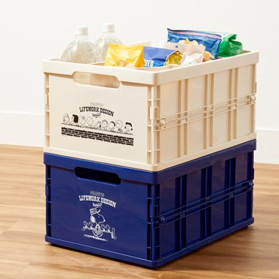 側面にスヌーピーが描かれた折り畳みコンテナ。掃除をしているスヌーピーや、チャーリー・ブラウン、マーシーなどの仲間たちがデザインされています。スリッパなどの小物や雑誌、おもちゃ、食品のストックを入れるといった幅広い用途の収納にぴったりです。