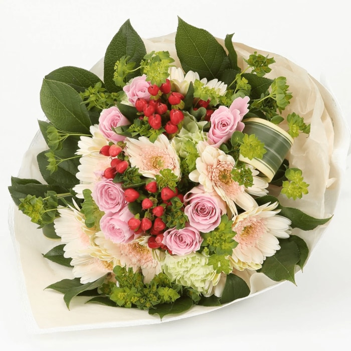 ネット限定の商品です。淡いピンクのガーベラとバラを主役に、実やグリーンをあわせたブーケとなっています。お誕生日や結婚祝い、出産祝いなどの贈りものにおすすめの商品です。