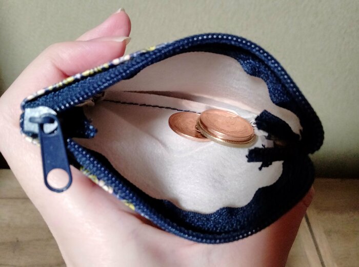 モリスデザインのコインケースは、写真のように硬貨を入れることができます。大きく口が開くので、中が見やすいです。