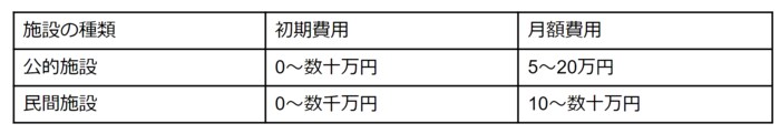 公的施設は公費で設立・運営されるため、月額で5~20万円程度と比較的費用が安く抑えられます。