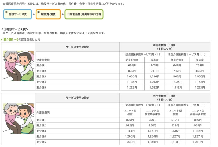 たとえばⅠ型介護医療院サービス費(Ⅰ)で要介護3、従来型個室の場合、1日につき1035円(利用者負担1割)です。
