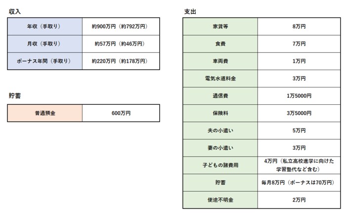 年収(手取り)は900万円(約792万円)、月収(手取り)は57万円(約46万円)。またボーナス年間(手取り)は220万円(約178万円)で、現在の普通預金残高は約600万円。