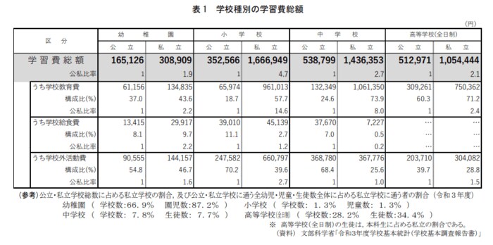 次は、文部科学省の「令和3年度 子供の学習費調査」で、高校3年間の学費をみてみましょう。