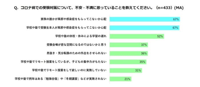 実際に、(株)マンダムが2020年12月23日に公表した「コロナ禍の受験対策で不安に思っていること」アンケートでは、家族や自分が風邪や感染症をもらってこないか不安視する声が最も多い結果となりました。