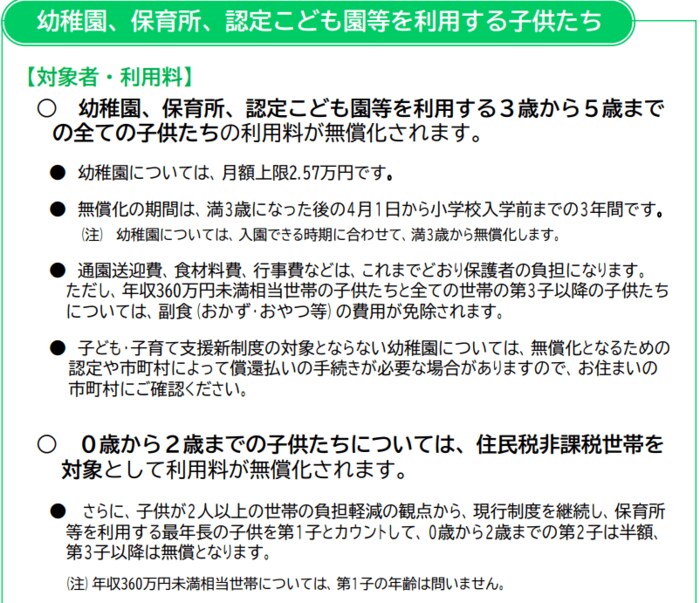3〜5歳児の保育は無料ですが、住民税非課税世帯に限り0〜2歳児の保育も無料です。