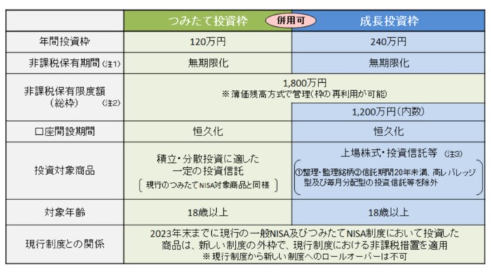 しかし、2024年1月以降は一般NISAが「成長投資枠」、つみたてNISAが「つみたて投資枠」となり、それぞれ併用が可能となります。