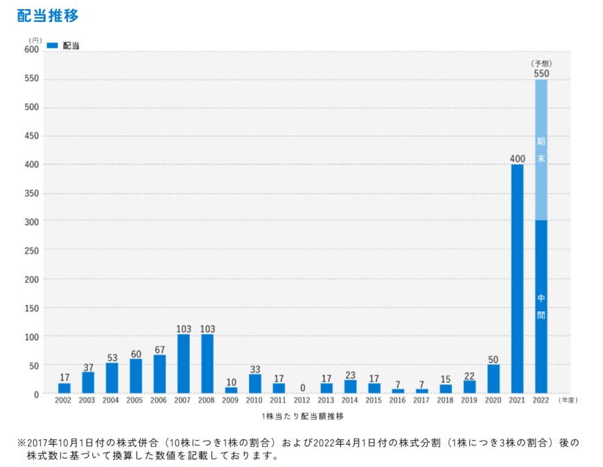 2021年度は1株当たり年間400円でしたが、2022年度は550円に配当を増やす方針であると公表しています。