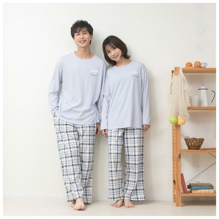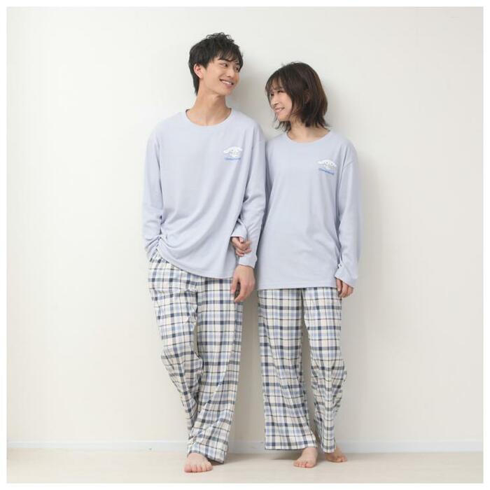 シナモロールとみるくのPOPなプリントがかわいいルームウェア。後ろ姿も可愛いプルオーバータイプで、チェックのボトムスに両サイドポケット付き。お揃いで着ていただける男女兼用での展開となています。