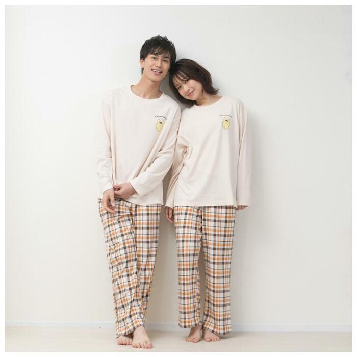 ポムポムプリンとお友達のPOPなプリントがかわいいルームウェア。後ろ姿も可愛いプルオーバータイプで、チェックのボトムスに両サイドポケット付き。お揃いで着ていただける男女兼用での展開となています。