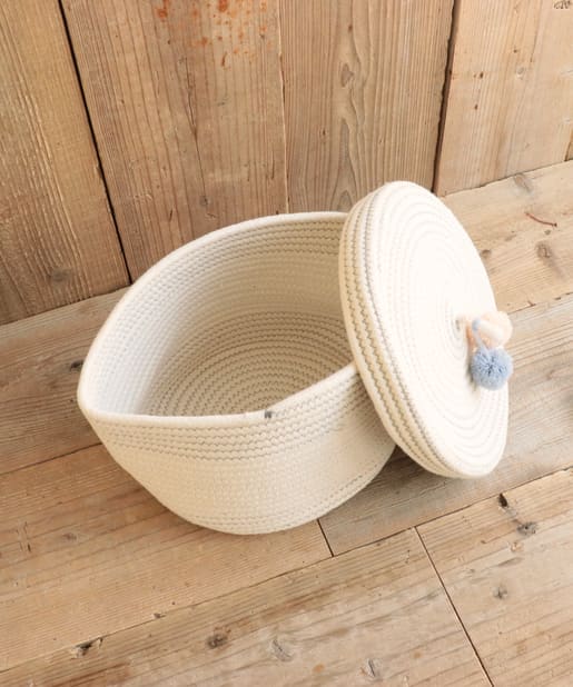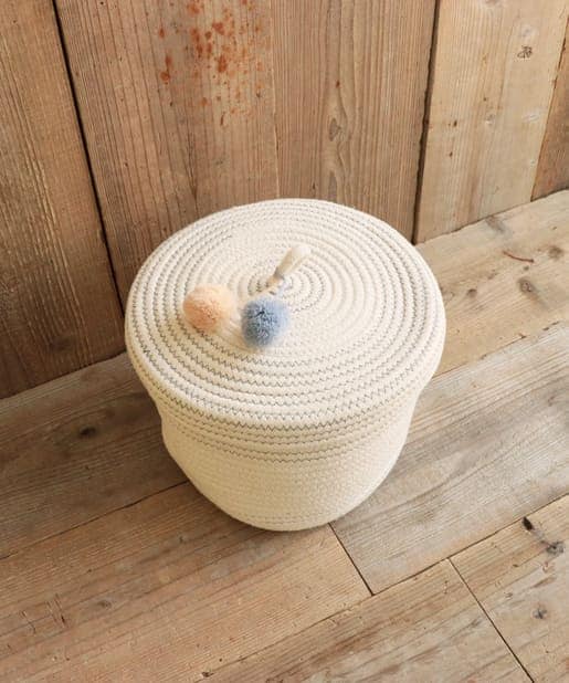 柔らかい素材でできたバスケットです。ポンポン付きで可愛らしく、優しいカラーリングなのでインテリアに合わせやすく、サニタリー用品やおもちゃ入れにもぴったり。