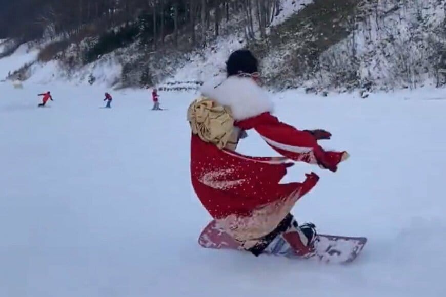 一緒に投稿された映像を見て驚き…振袖のままスノーボードで滑っているのです。重量のある振袖を着ているとは思えないほど、軽快な動きですね。
