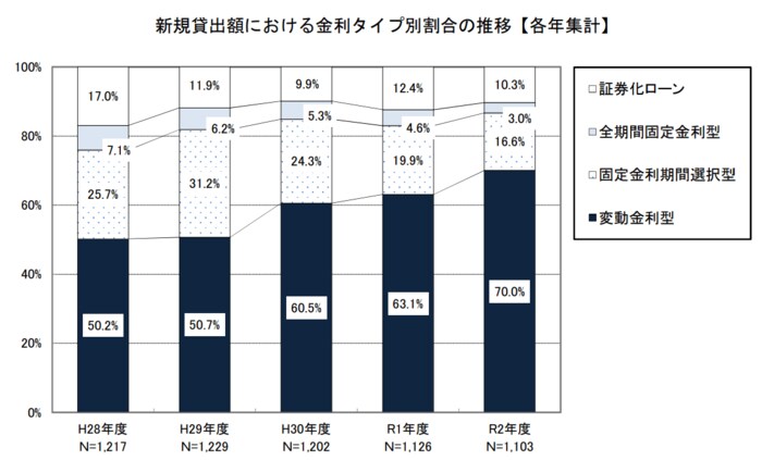 2022年11月14日に公表された国土交通省「令和3年度 民間住宅ローンの実態に関する調査 結果報告書」 によると、2020年度は変動金利型を選んだ人が全体の7割でした。