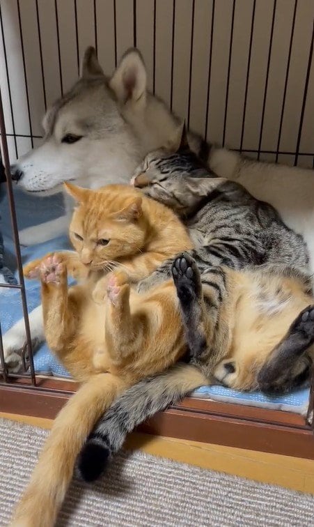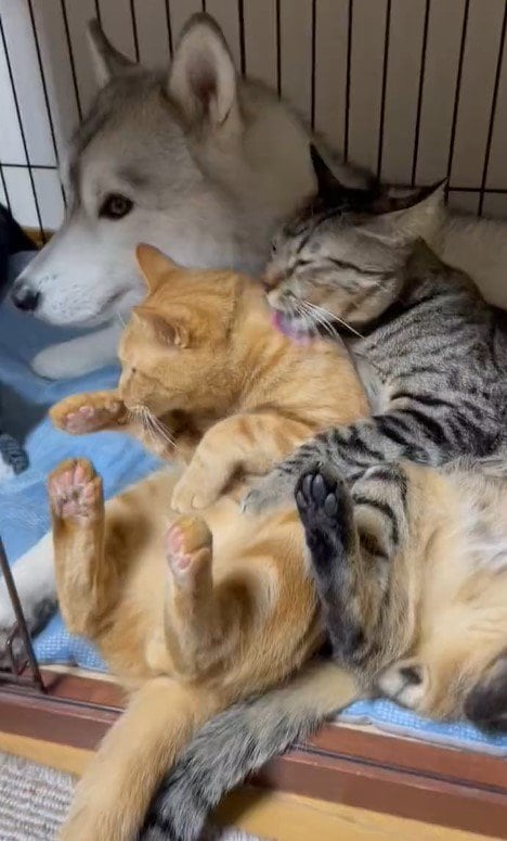 ハスキー犬のハウスに集まる猫さんたち。微笑ましい光景が話題に